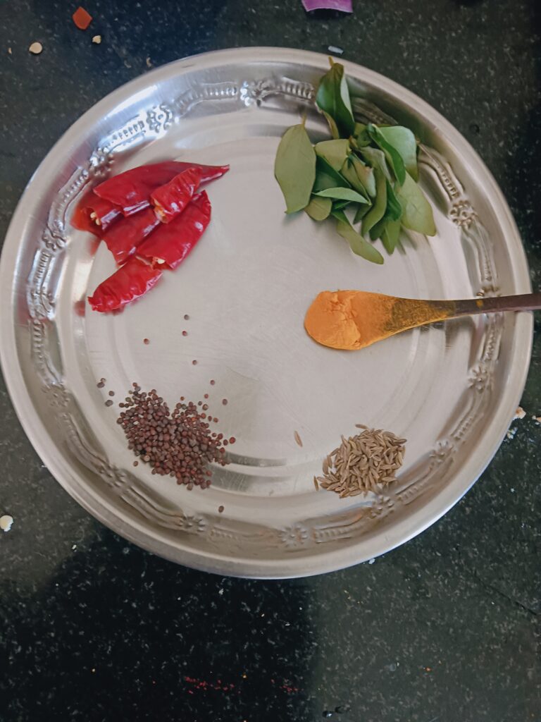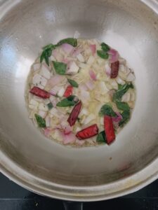 3. Take a pan and switch ON the stove ,heat 2 tablespoon oil in that pan. Add mustard seeds, cumin seeds, red chilis, curry leaves , when they begin to splutter add onions and mix it well and the last add the capsicum pieces and turmeric powder