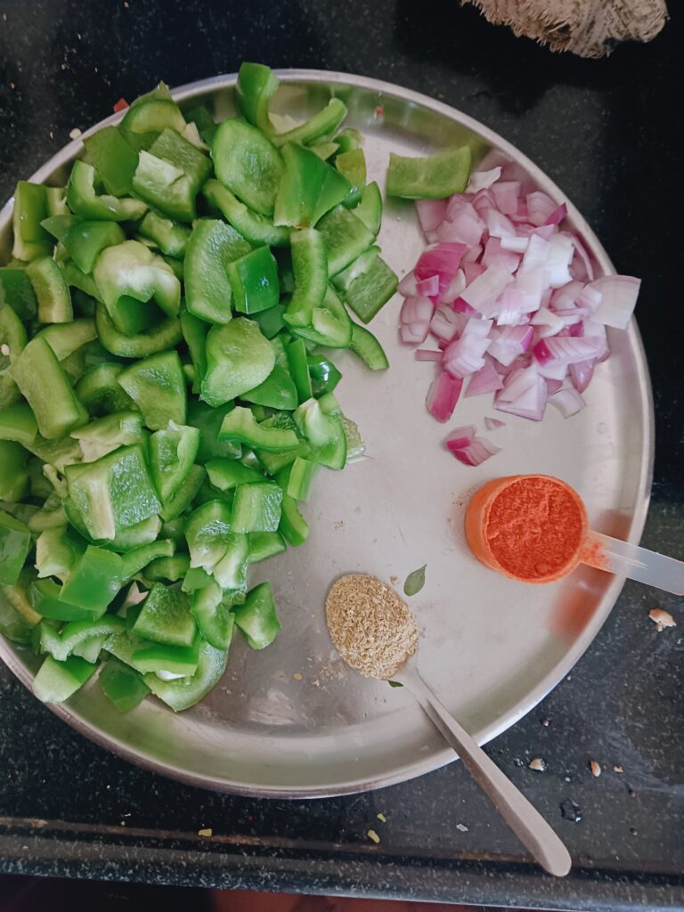 Make this capsicum curry with any kind of bell peppers like green, red or yellow. Here I am taking only green bell pepper(capsicum), If you mix of all 3 types of bell peppers is also good taste.