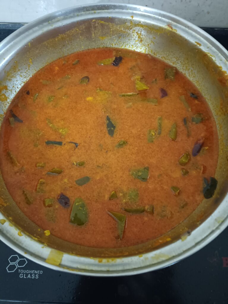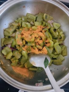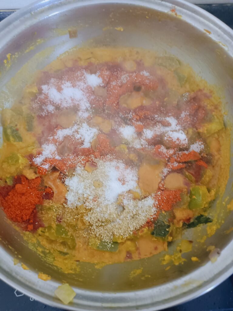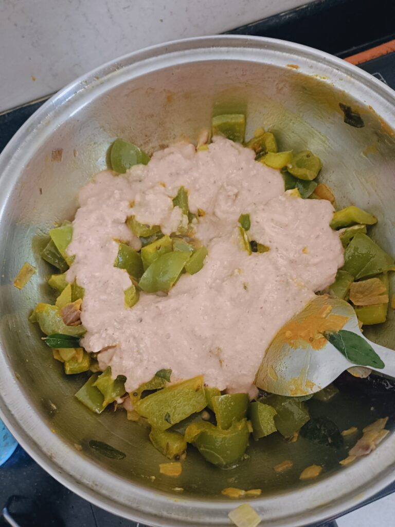 6. Add the water to get the desired consistency and add the salt as per your taste. Mix every thing well and bring it to a boil, Cook covered till the capsicum is partially cooked yet crunchy.