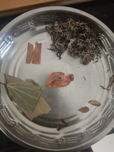 • f.    1 bay leaf, 2 cloves, 2cardamoms(Elachi’s), 2 cinnamon sticks, little stone