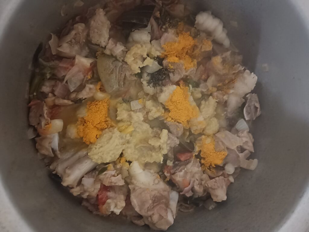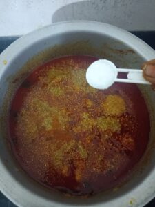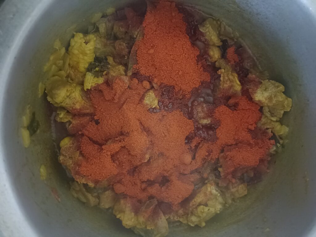 4. Add turmeric powder and ginger garlic paste , add red chili powder as per your tasty.