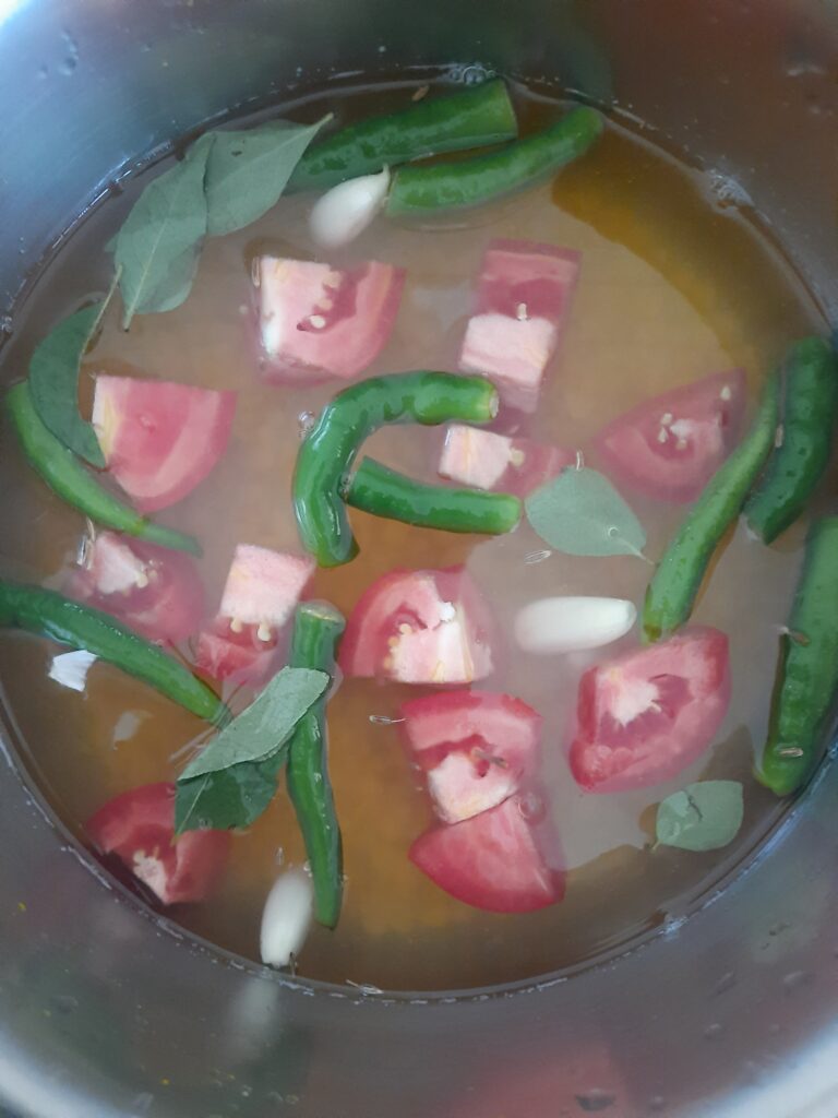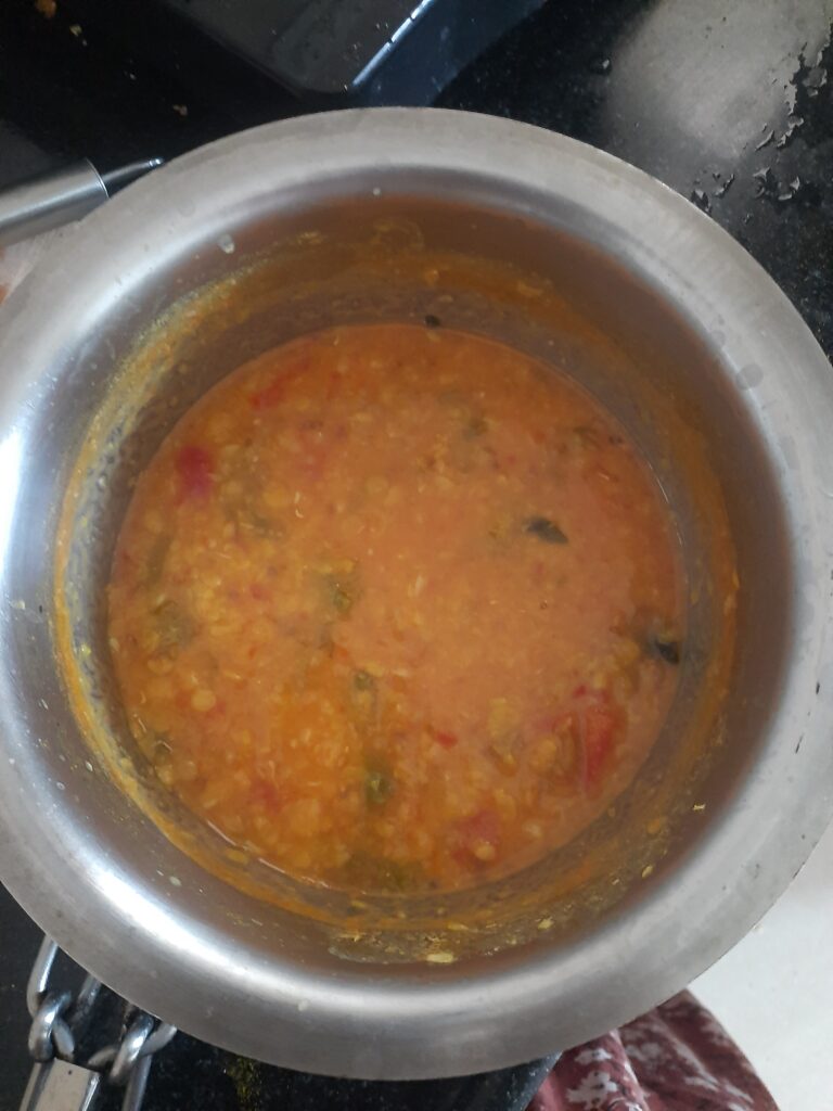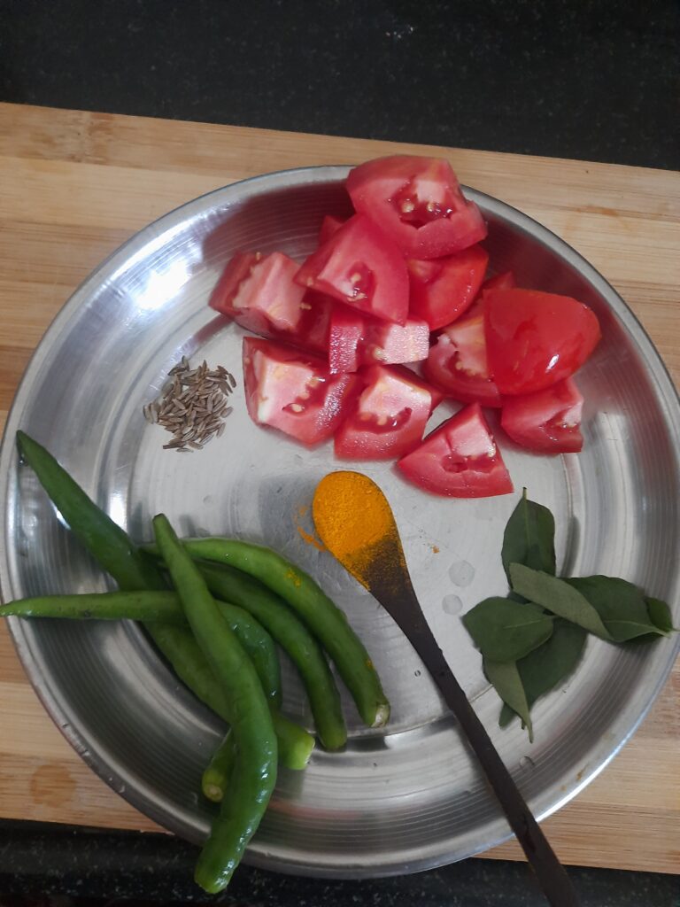 1.Wash and cook 1/2 cup dal with 1/4 cup of water, add green chilies, Tomatoes, cumin/jeera seeds, turmeric, 3 garlic and curry                     leaves(optional) into the vessel.