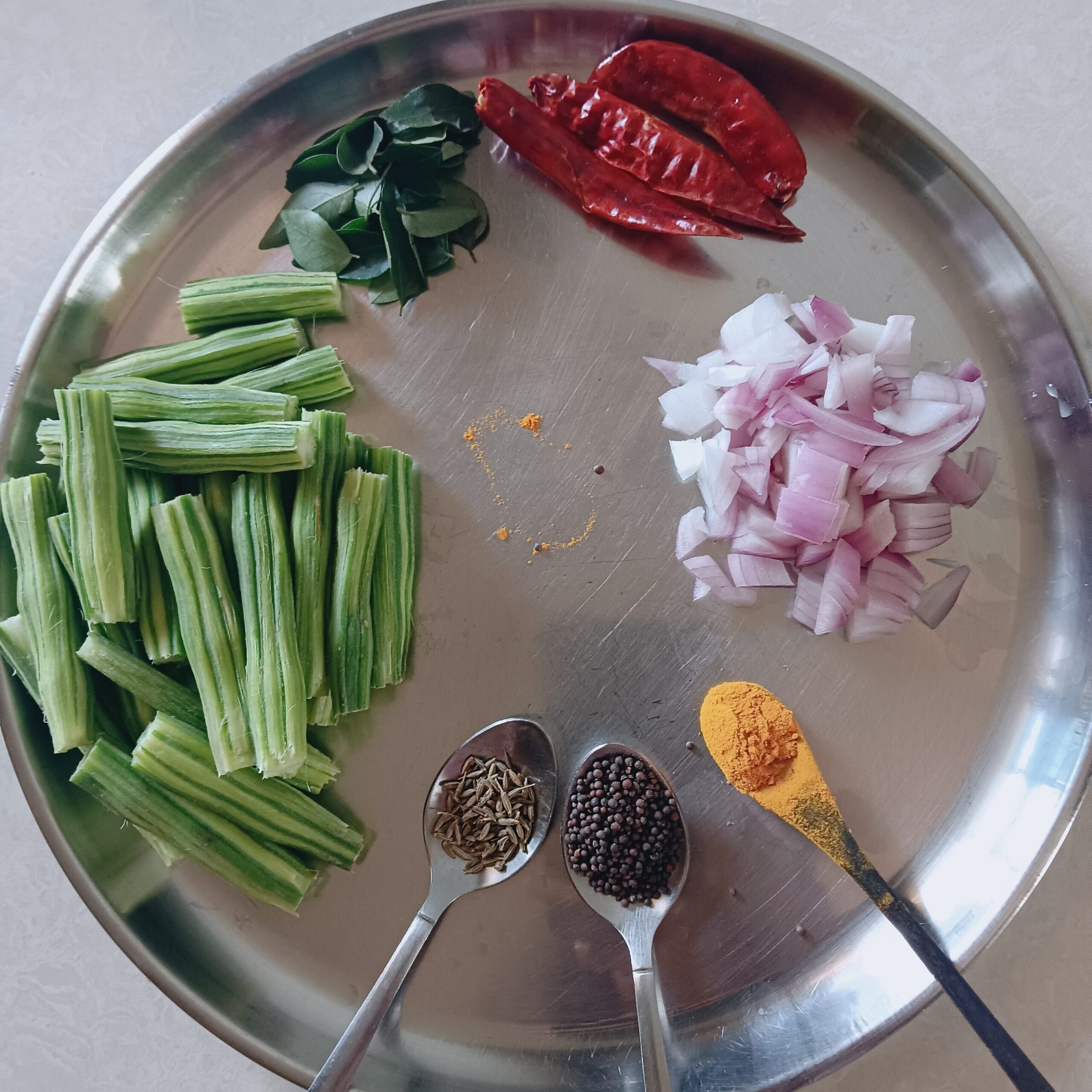 4. Soak tamarind in cup and squeeze it &set aside. Pour 2 tablespoon oil or ghee into a hot pan. When it turn hot add cumin/jeera seeds,   mustard seeds, they get into splutter now add red chili, curry leaves, onions, drumsticks and last add some turmeric. Mix it well.