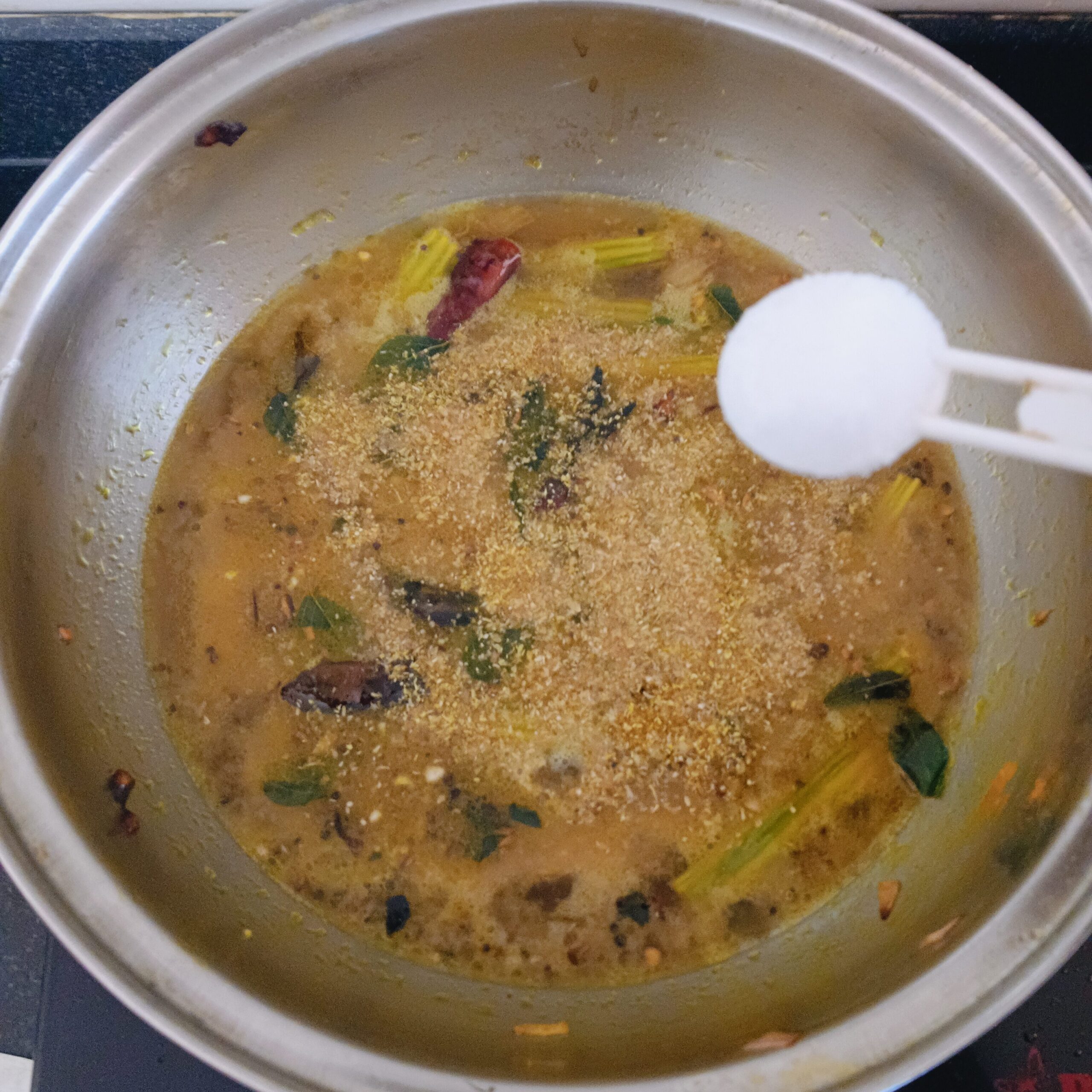 7. When the Pappu Charu comes to a boil, switch off the stove and add the coriander leaves with (I am not added) and keep it covered.