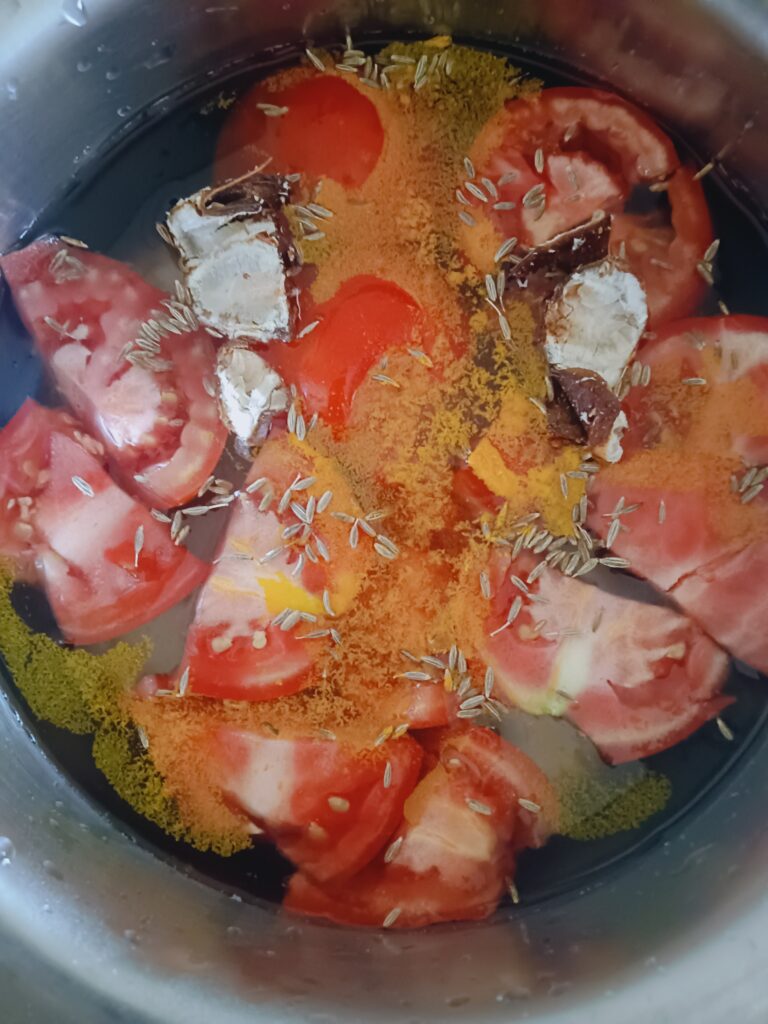 1. Take a pot, I am taking 250 grams tomatoes and add the chopped tomatoes into the pot and pour 2 cups of water, add 2or3 tamarind strips for sourness, add little jeera and turmeric for tasty.