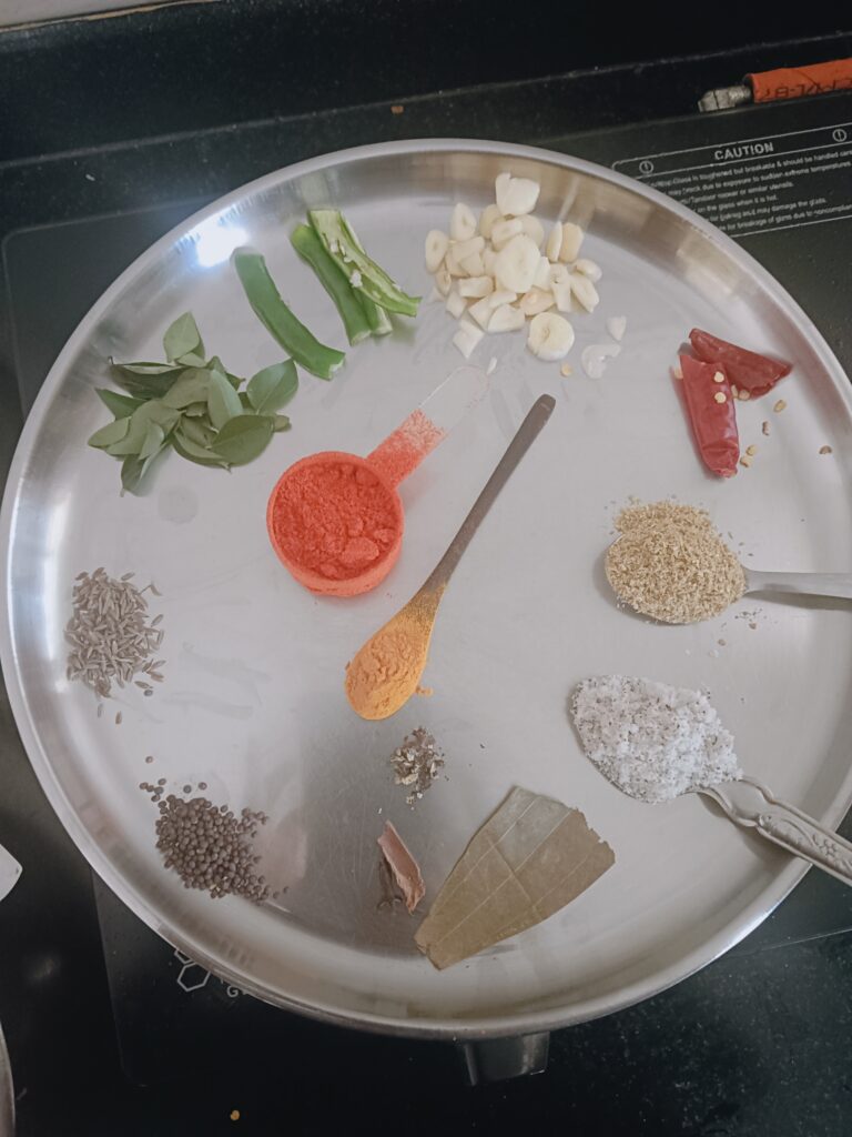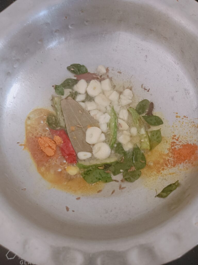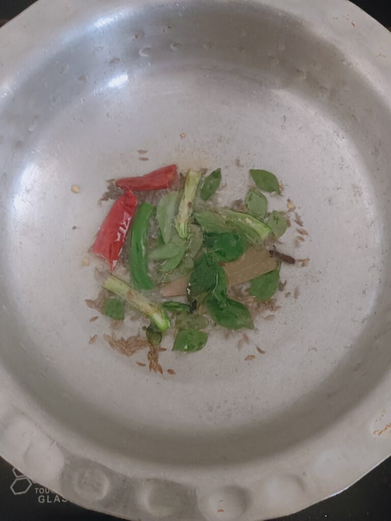 3. Take a pan and heat it, add the 1 tablespoon oil or ghee. Add the mustard seeds, jeera seeds, green chili & red chili, curry leaves and spices( bay leaf, clove, cinnamon stick) and fry it for a 1 or 2 mins.