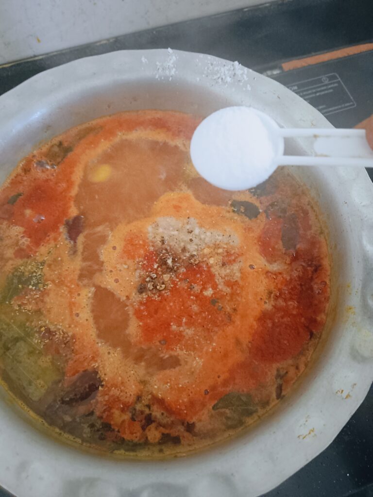 6. Now, add the red chili powder(as per our taste), salt, coriander powder, coconut powder and last add little pepper powder. Boil the rasam for 7 to 8 mins and turn OFF the flame. Our Tomato Rasam Recipe is ready.